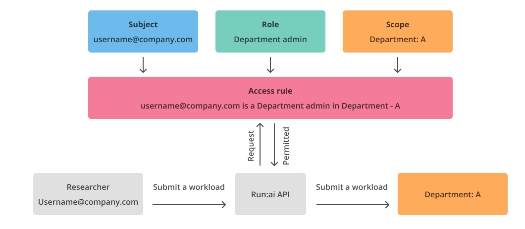 RBAC at NVIDIA Run:ai is configured using access rules. An access rule is the assignment of a role to a subject in a scope: <Subject> is a <Role> in a <Scope>.