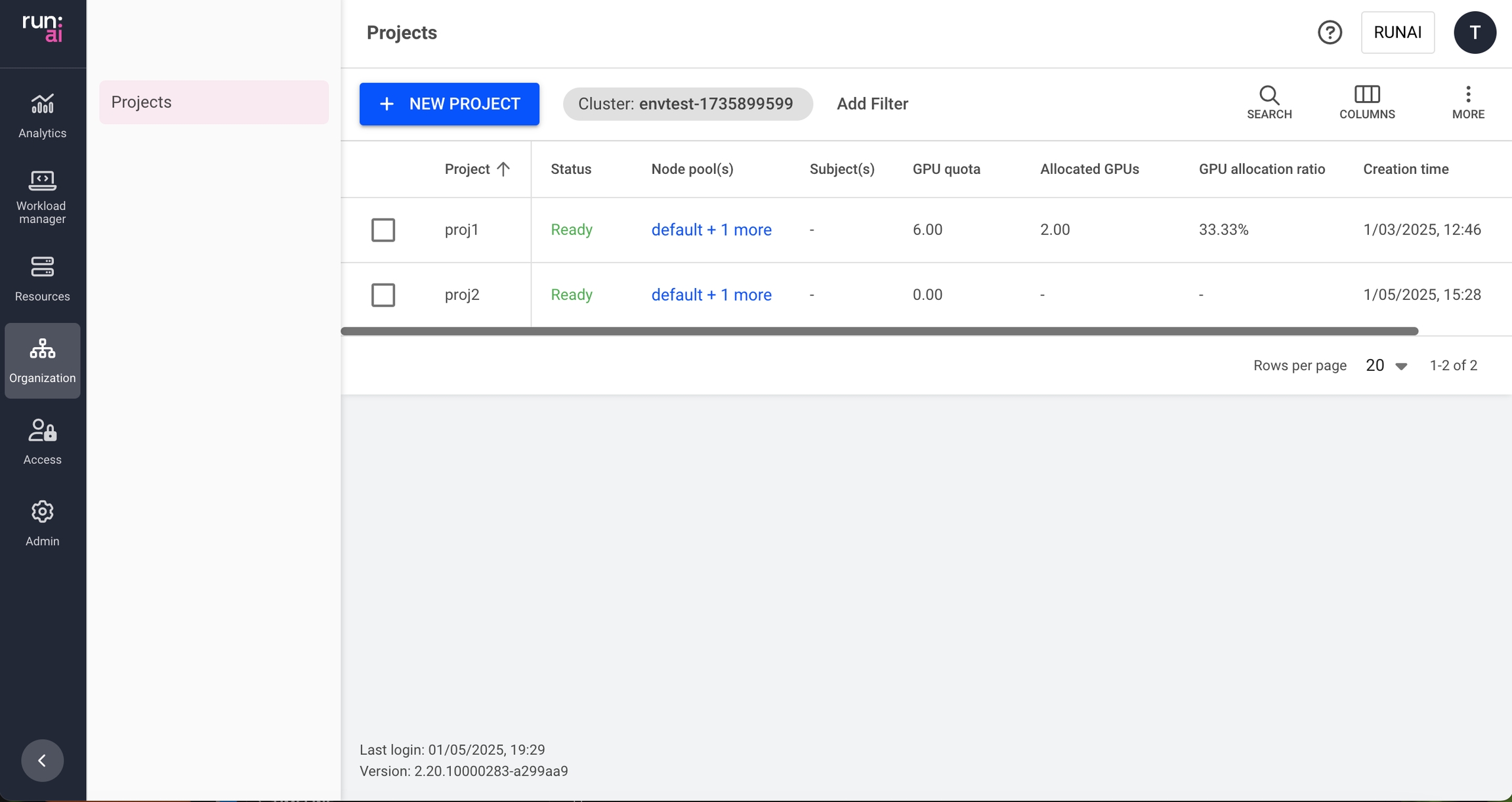 The Projects table can be found under Organization in the NVIDIA Run:ai platform.
