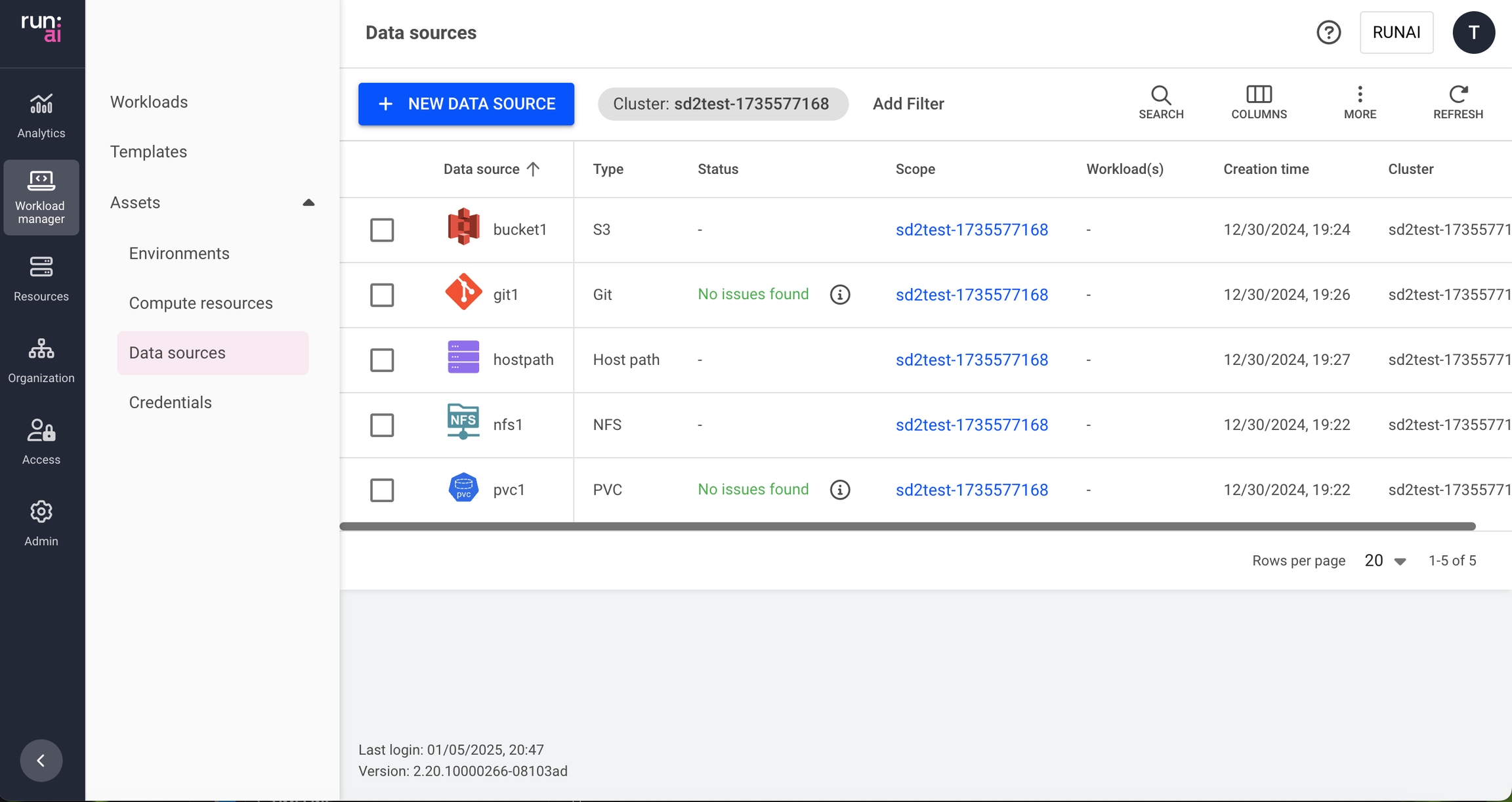 The data sources table can be found under Workload manager in the NVIDIA Run:ai platform.