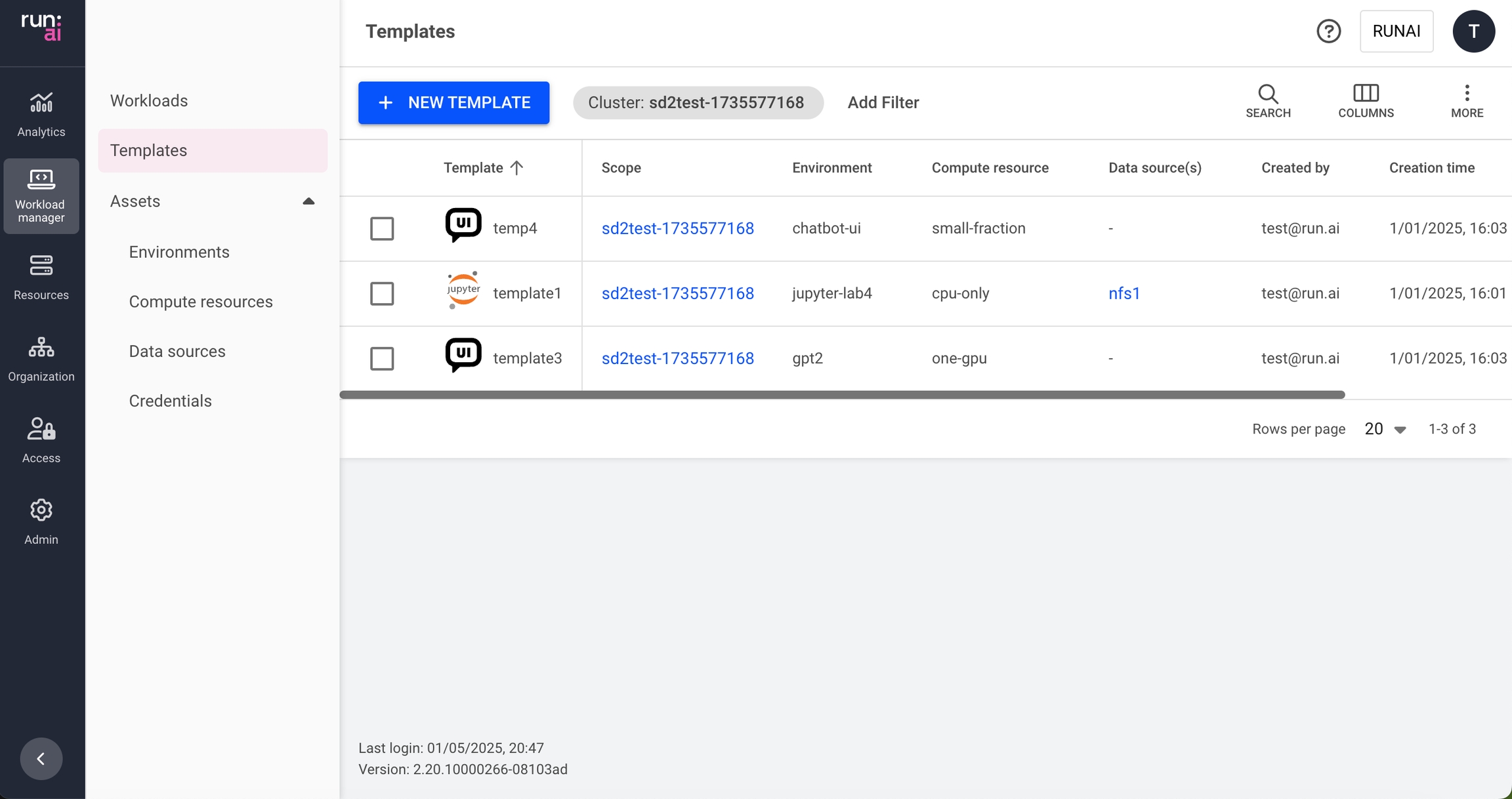 A template is a pre-set configuration that is used to quickly configure and submit workloads using existing assets. A template consists of all the assets a workload needs, allowing researchers to submit a workload in a single click, or make subtle adjustments to differentiate them from each other.