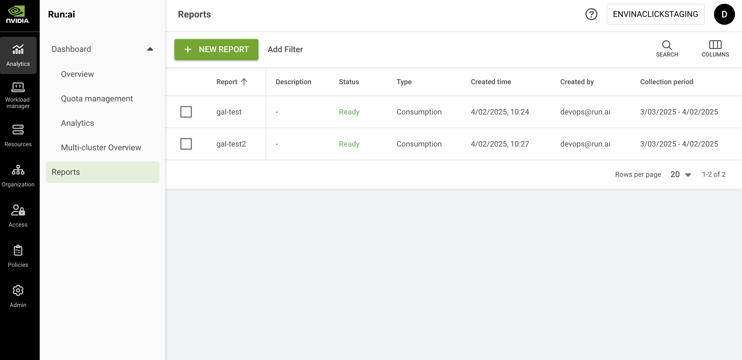The Reports table can be found under **Analytics** in the NVIDIA Run:ai platform.