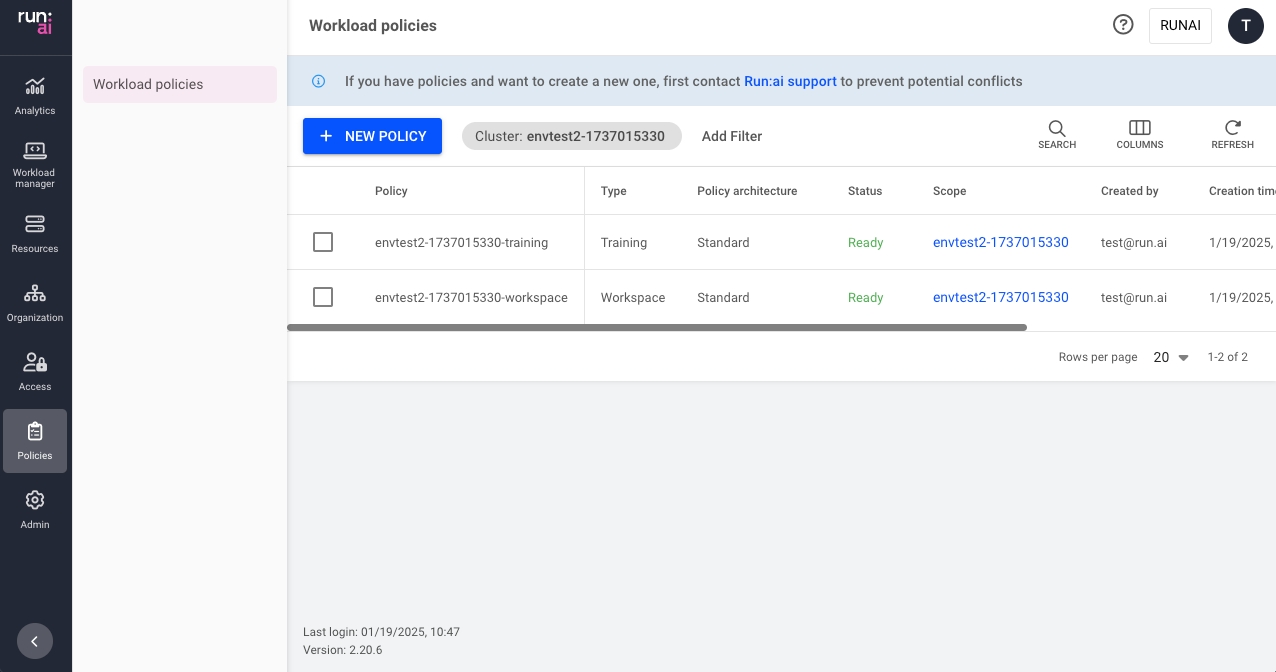 If you have policies and want to create a new one, first contact NVIDIA Run:ai support to prevent potential conflicts