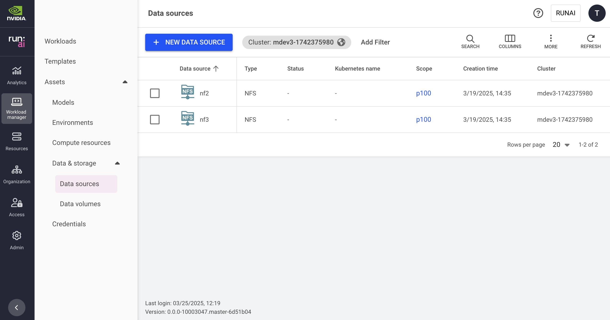 The data sources table can be found under **Workload manager** in the NVIDIA Run:ai platform.