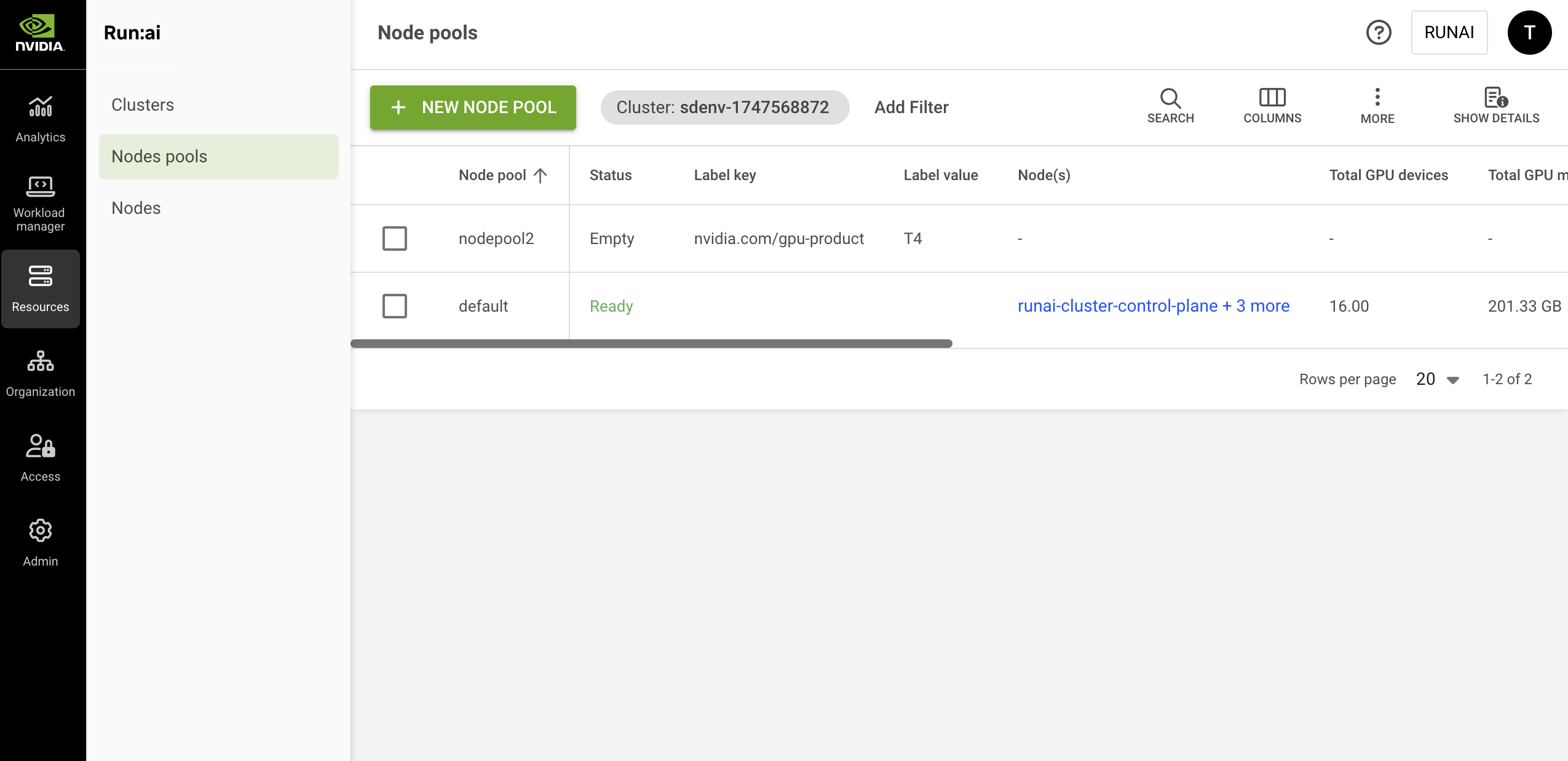 | Node(s)                          | List of nodes included in this node pool. Click the field to view details (the details are in the [Nodes](https://run-ai-docs.nvidia.com/self-hosted/2.22/platform-management/aiinitiatives/resources/nodes) article).                                                                                                                                                                                                                                                                              |