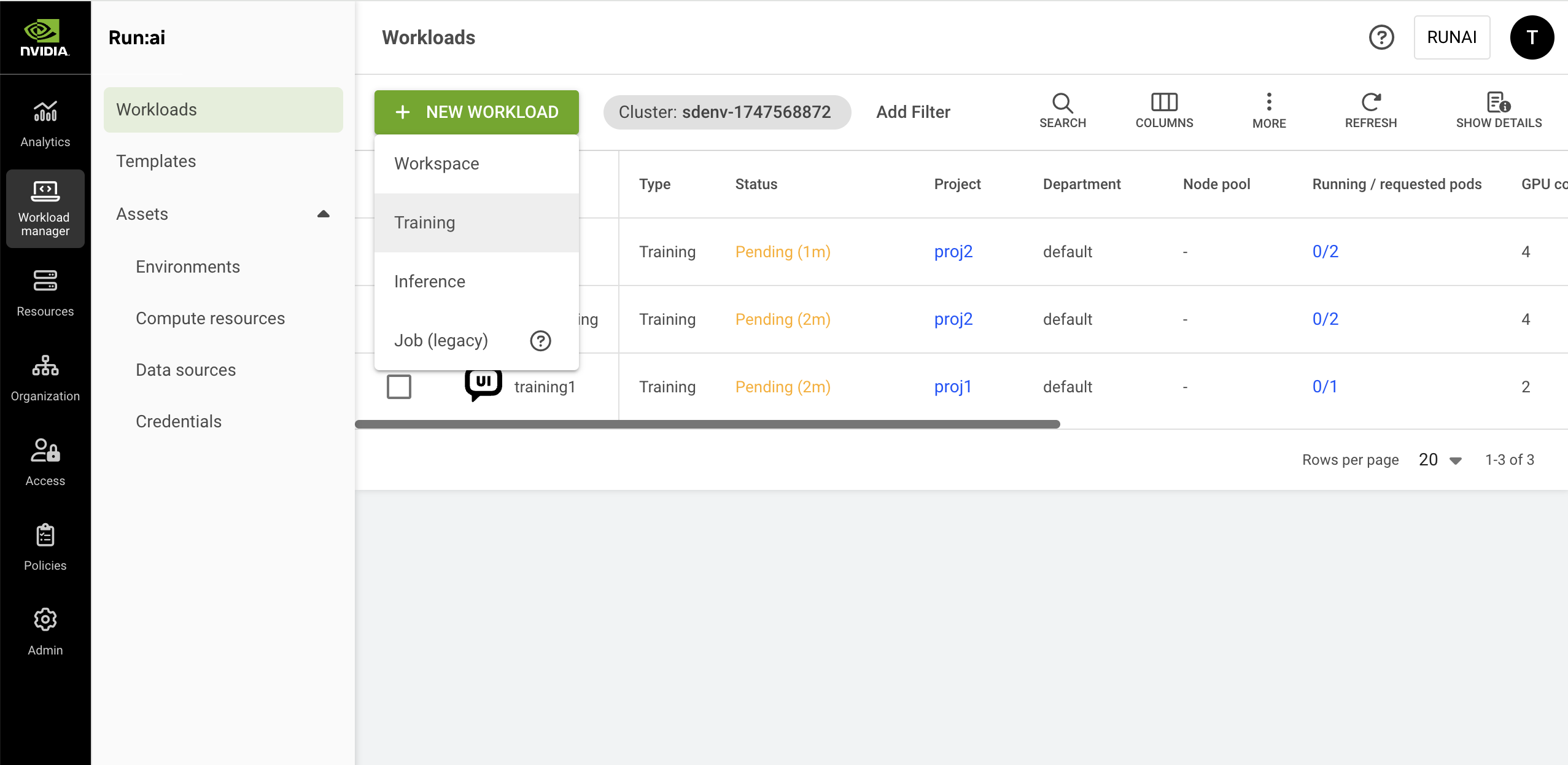 2. Click **+NEW WORKLOAD** and select **Training** from the drop-down men&#x75;**.**