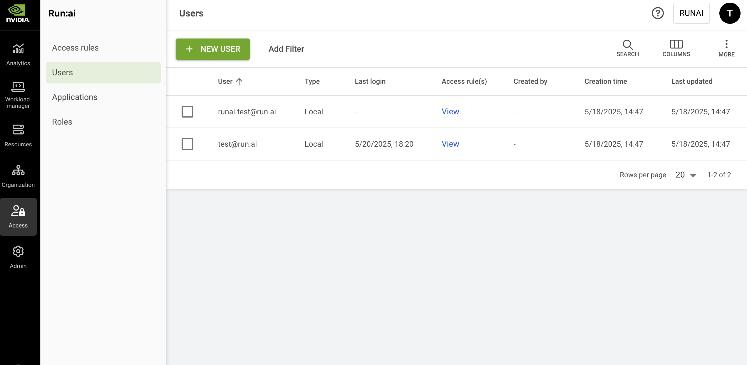 You can manage users and user permissions (access rules) for both local and [SSO users](https://run-ai-docs.nvidia.com/self-hosted/infrastructure-setup/overview#single-sign-on-sso).